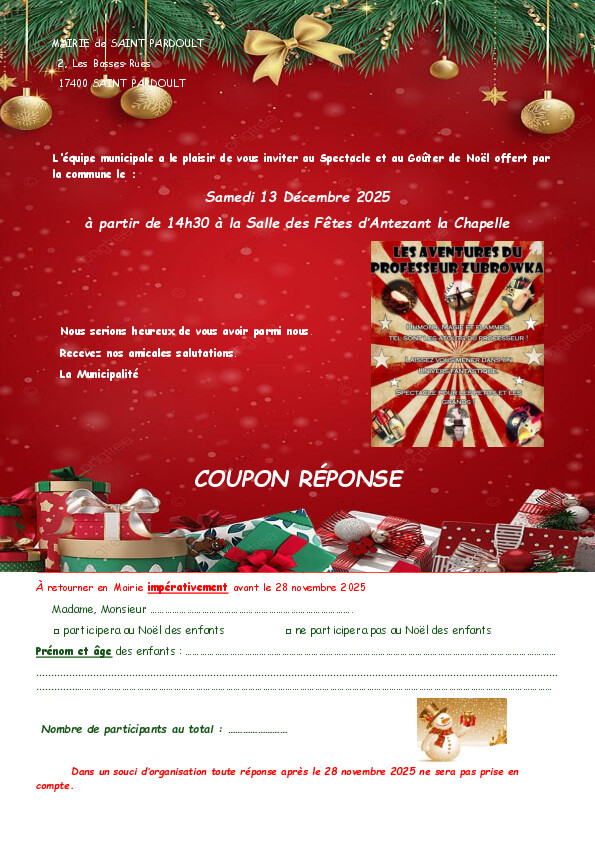 Il reste quelques jours pour vous inscrire au spectacle de Noël du samedi 13 décembre.