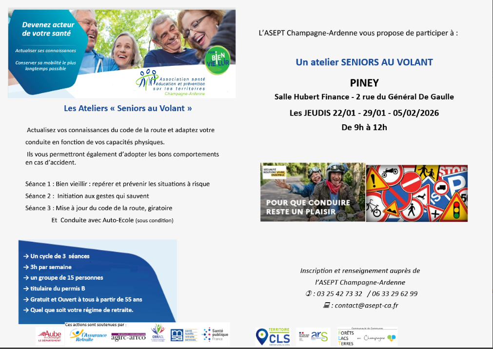 Dans le cadre du Contrat Local de Santé de la Communauté de Communes Forêts Lacs Terre en Champagne et avec le soutien du Conseil départemental de l’Aube et de la MSA Sud Champagne, l’ASEPT Champagne-Ardenne organise