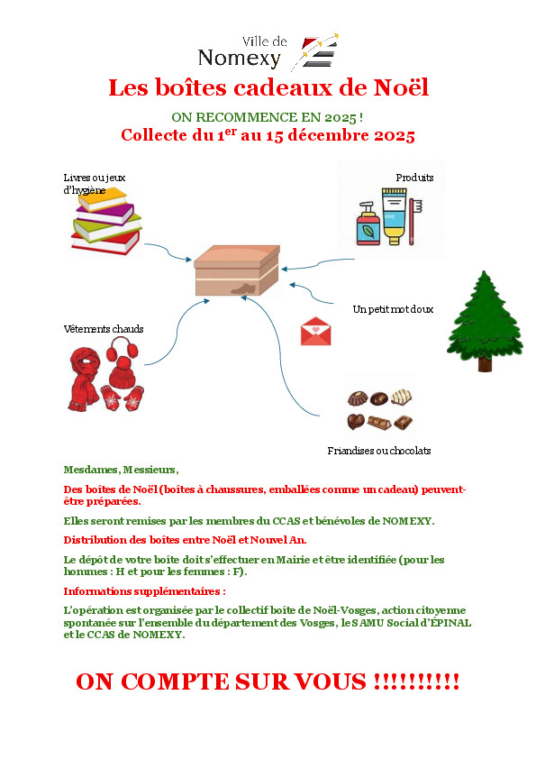 Opération organisée par le collectif Boîtes de Noël-Vosges, action citoyenne spontanée menée par les bénévoles de divers horizons sur l’ensemble du département des VOSGES et le Samu social d’ÉPINAL.