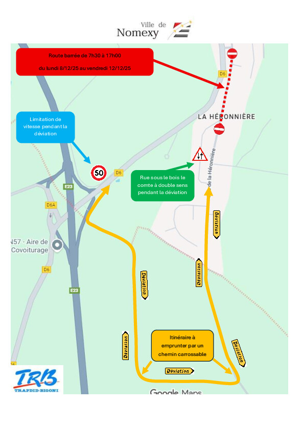Une déviation sera mise en place par le haut de la rue de la Héronnière et empruntera le bois d'Igney et le chemin rural qui rejoint l'échangeur de la RN57, sur la RD6 direction Frizon.