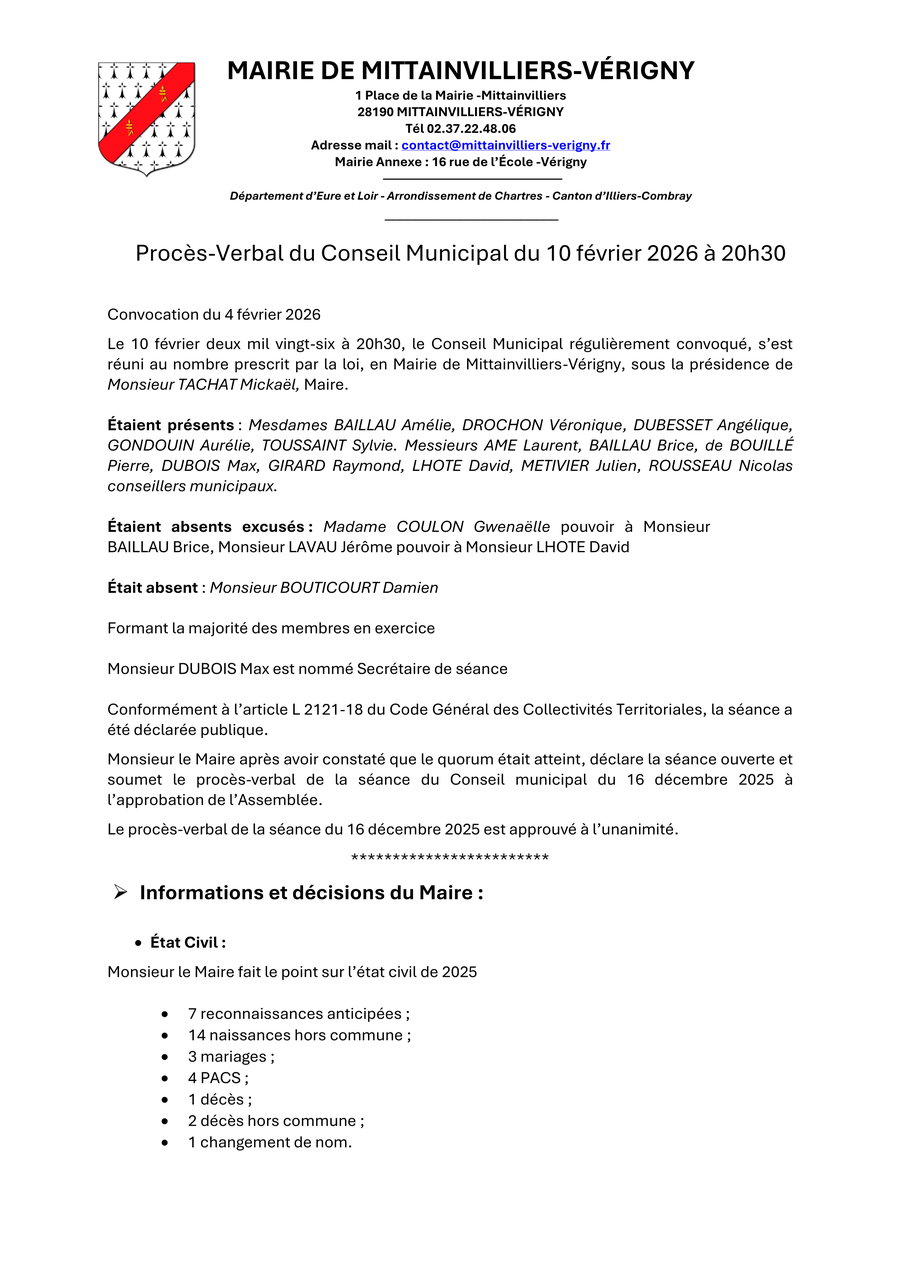 Suite au conseil municipal d'installation du 21 mars, le Procès-Verbal du conseil municipal du 10 février et les délibérations prises lors de ce conseil ainsi que la tableau définitif du Conseil Municipal sont affichés devant la mairie et disponible ci-dessous.