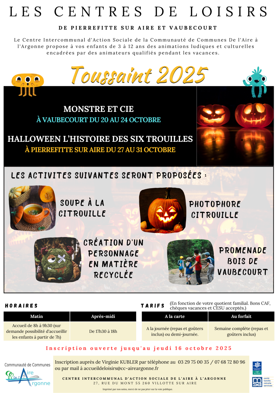 📣 Les inscriptions pour les centres de loisirs de la Toussaint à Pierrefitte sur Aire et Vaubecourt sont ouvertes jusqu'au 16 octobre pour les enfants de 3 à 12 ans. 🤗