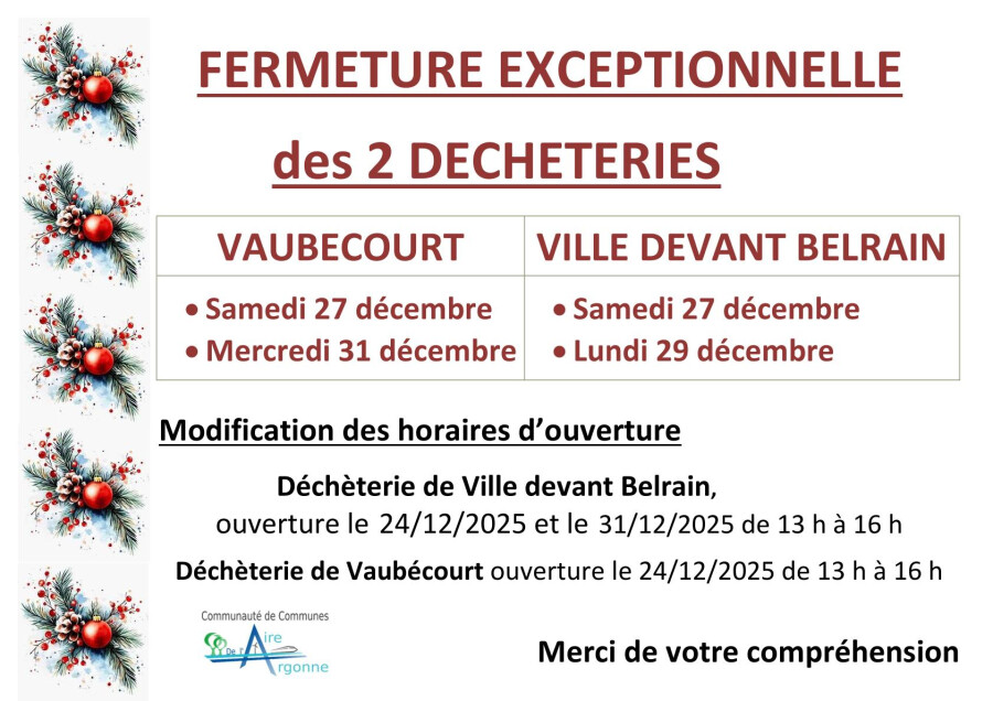 sera fermé du jeudi 25 décembre au lundi 29 décembre inclus.
