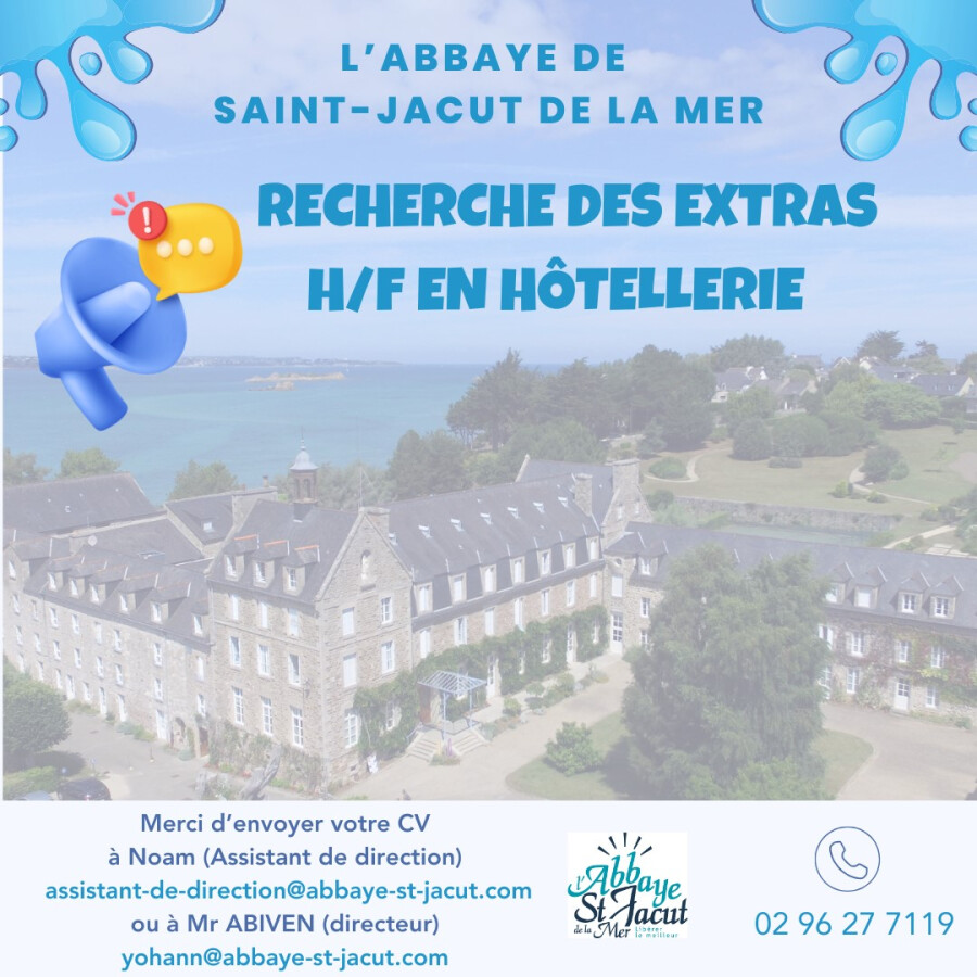 Pour ce mois d’octobre, l’Abbaye de Saint-Jacut-de-la-Mer recherche des extras femmes et hommes pour renforcer l’équipe hôtellerie.
