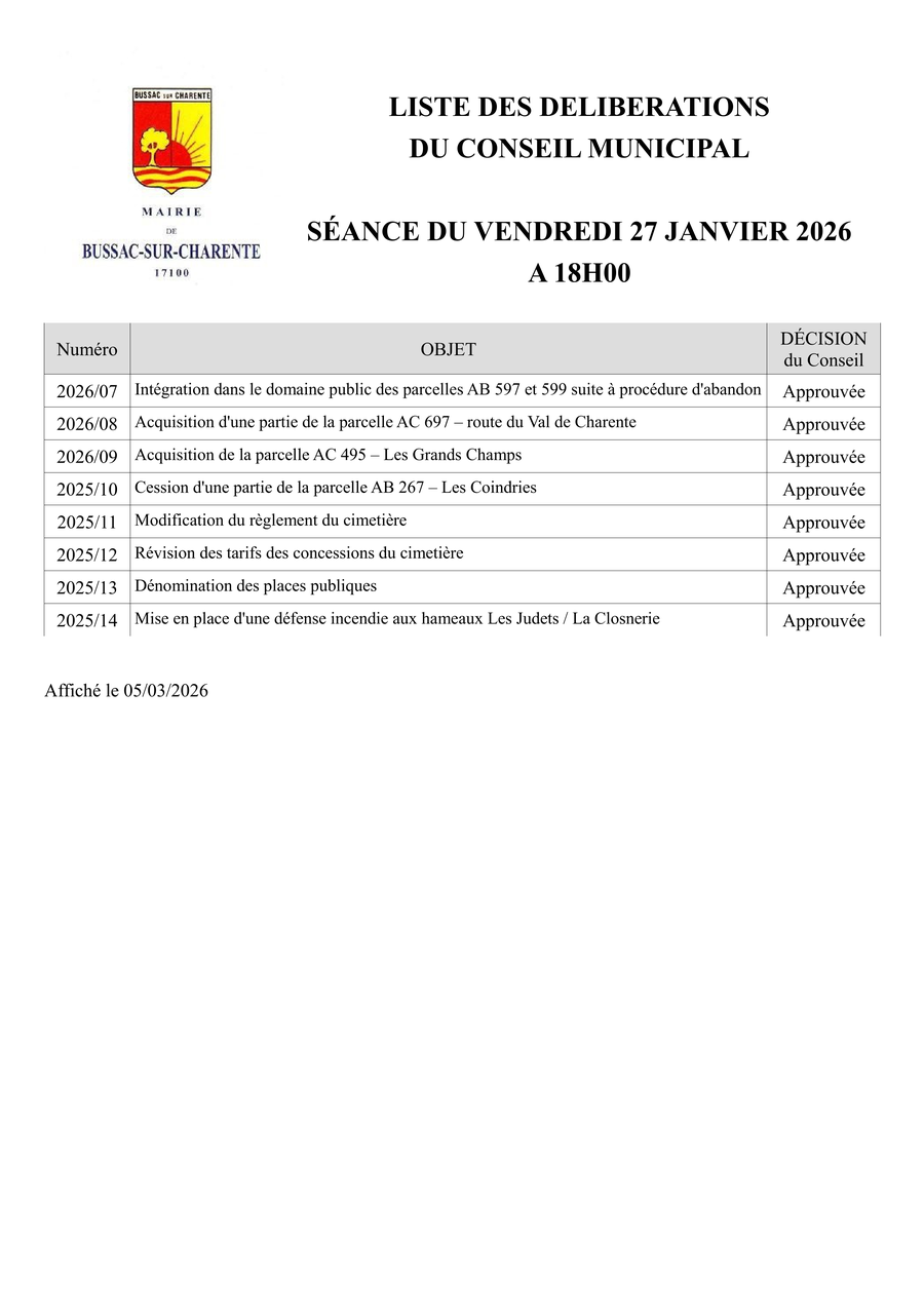 L'arrêté du 24 février 2026 portant reconnaissance de l'état de catastrophe naturelle, suite aux inondations, reconnait Bussac sur Charente dans la liste des communes concernées.
