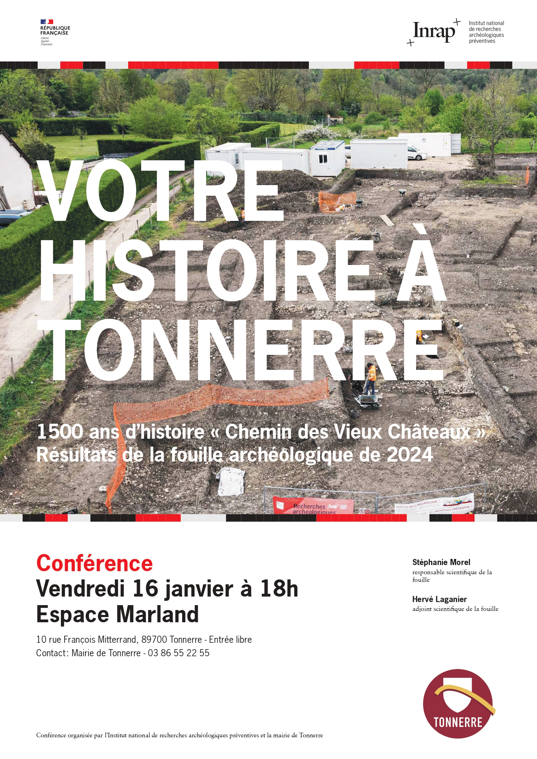 🏺 VENDREDI 16 JANVIER - 18h00 Conférence Archéologique : "Votre histoire à Tonnerre" Venez découvrir les résultats passionnants de la fouille de 2024 au « Chemin des Vieux Châteaux ». Stéphanie Morel et Hervé Laganier (Inrap) vous révéleront 1500 ans d'histoire locale. 📍 Espace Marland (10 rue François Mitterrand) 🎟️ Entrée libre 📞 Renseignements : 03 86 55 22 55