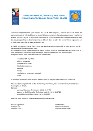 Le Comité Départemental Sport Adapté du Loir & Cher organise, avec le club AAJB tennis, en partenariat avec la ville de Blois et le conseil départemental, un championnat de France Para-Tennis Adapté, du 12 au 14 juin 2026 pour des personnes en situation de déficience intellectuelle et/ou avec des troubles psychiques. Ce championnat se déroule dans le cadre des compétitions organisées par la Fédération Française de Sport Adapté (FFSA).