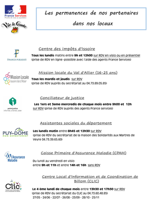 👇permanences de partenaires assurées dans les locaux France services de Vic-le-Comte