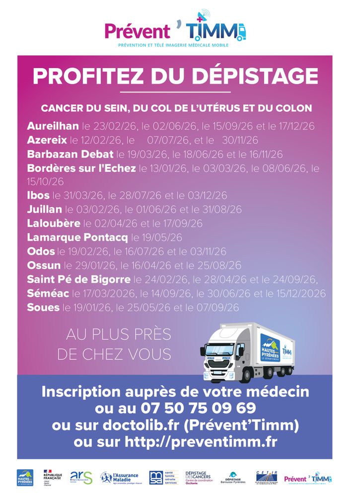 Le camion Prévent’TIMM est un dispositif dédié à la prévention santé et au dépistage organisé des cancers du sein, du col de l’utérus et du côlon. Il est piloté par le Département des Hautes-Pyrénées et l’ARS 65, en partenariat avec la CPAM, la MSA.