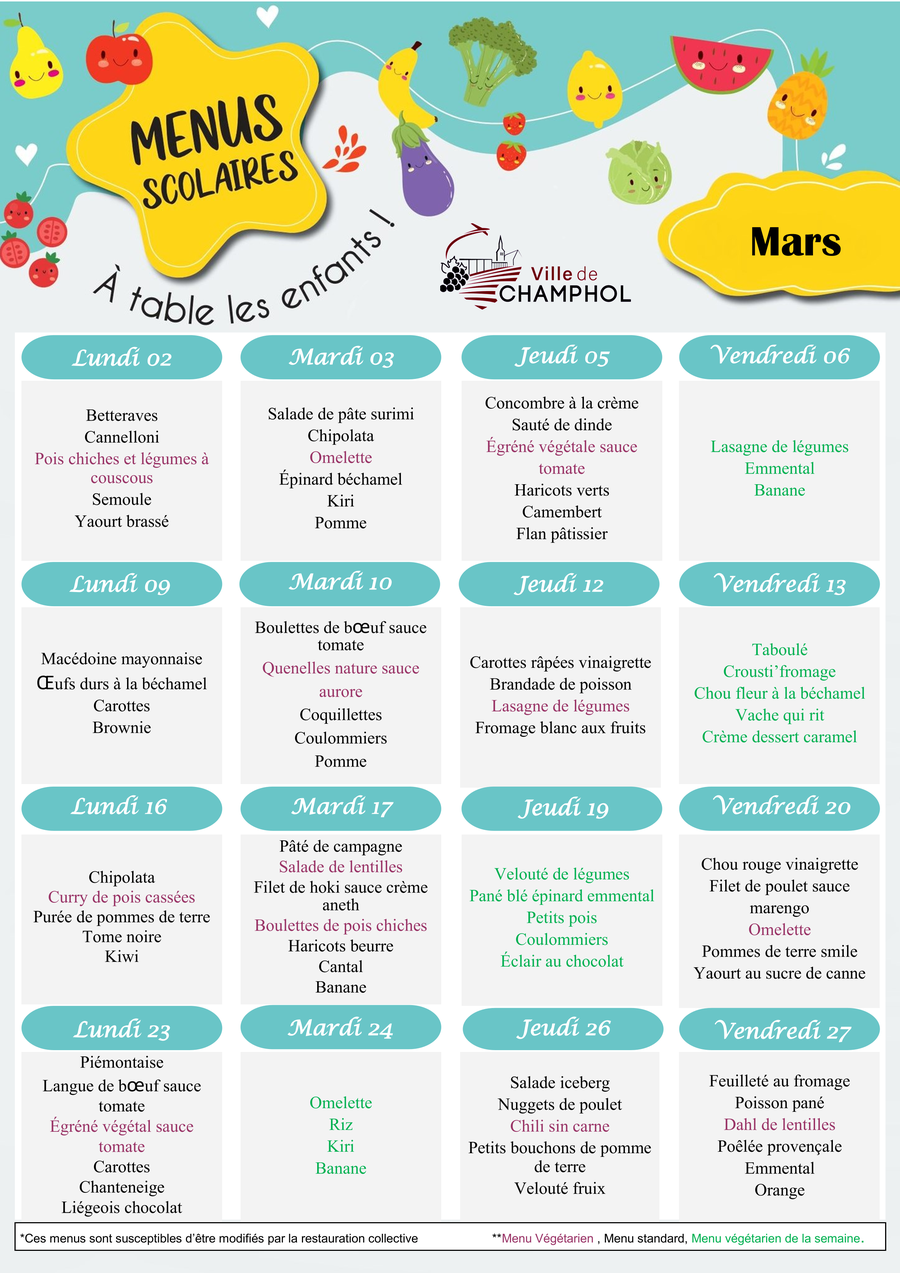 Découvrez ci-après les menus prévus au restaurant scolaire pour le mois de mars