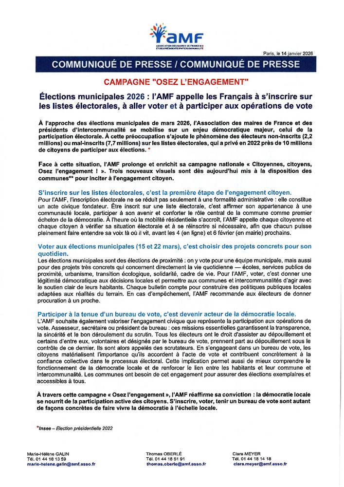 - L’inscription sur les listes électorales peut être réalisée en ligne au plus tard le mercredi 04 février 2026