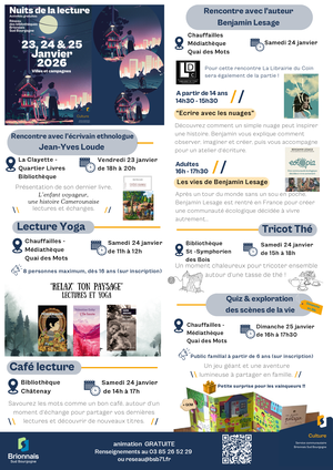 Votre réseau de bibliothèques vous propose un programme varié pour « Les nuits de la lecture », rencontres d’auteurs, lectures, quiz et même du yoga et tricot !