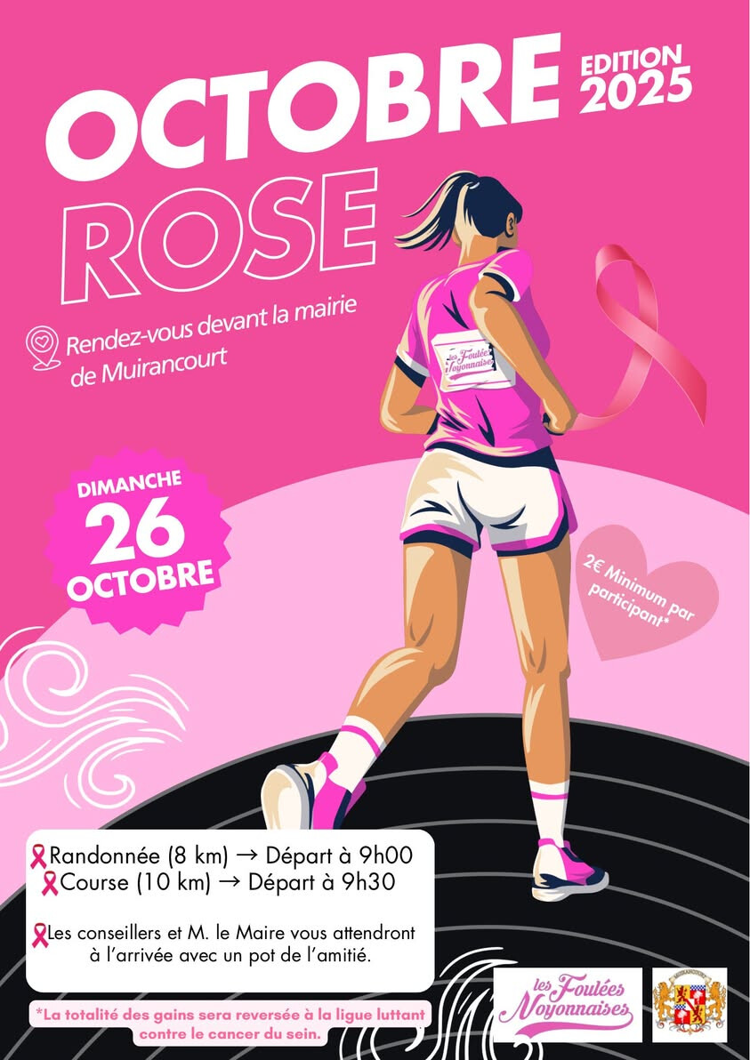 Les Foulées Noyonnaises vous donnent rendez-vous Dimanche 26 octobre à partir de 9h à la mairie de Muirancourt pour une sortie spéciale Octobre Rose.