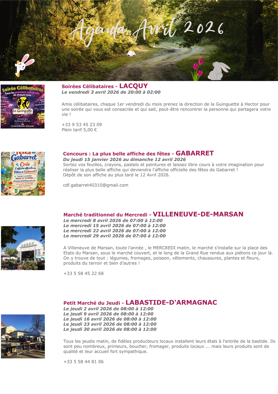 Avril est là, et avec lui un vent de renouveau souffle sur les Landes d’Armagnac ! Entre nature qui s’éveille, expériences gourmandes et découvertes authentiques, c’est le moment idéal pour (re)partir à la rencontre de notre territoire. Que vous soyez amateur de balades, curieux de patrimoine ou épicurien dans l’âme, laissez-vous guider...!