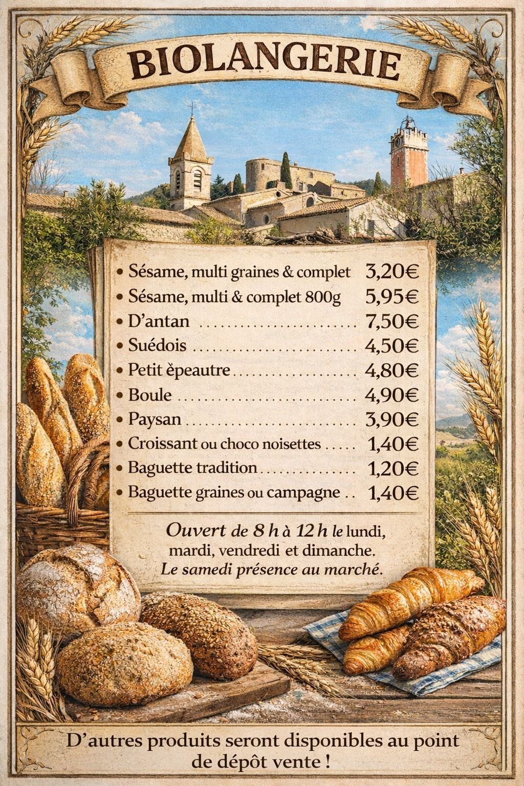 Ce nouvel espace ouvrira à compter du lundi 30 mars, de 7h30 à 11h30, et ce tant que la boulangerie communale restera fermée. Il accueillera le public les lundi, mardi, mercredi, jeudi, vendredi à ces horaires. La boulangère sera présente le samedi matin sur le marché, aux côtés des autres artisans. Le dimanche le dépôt sera ouvert de 8h à 12h.