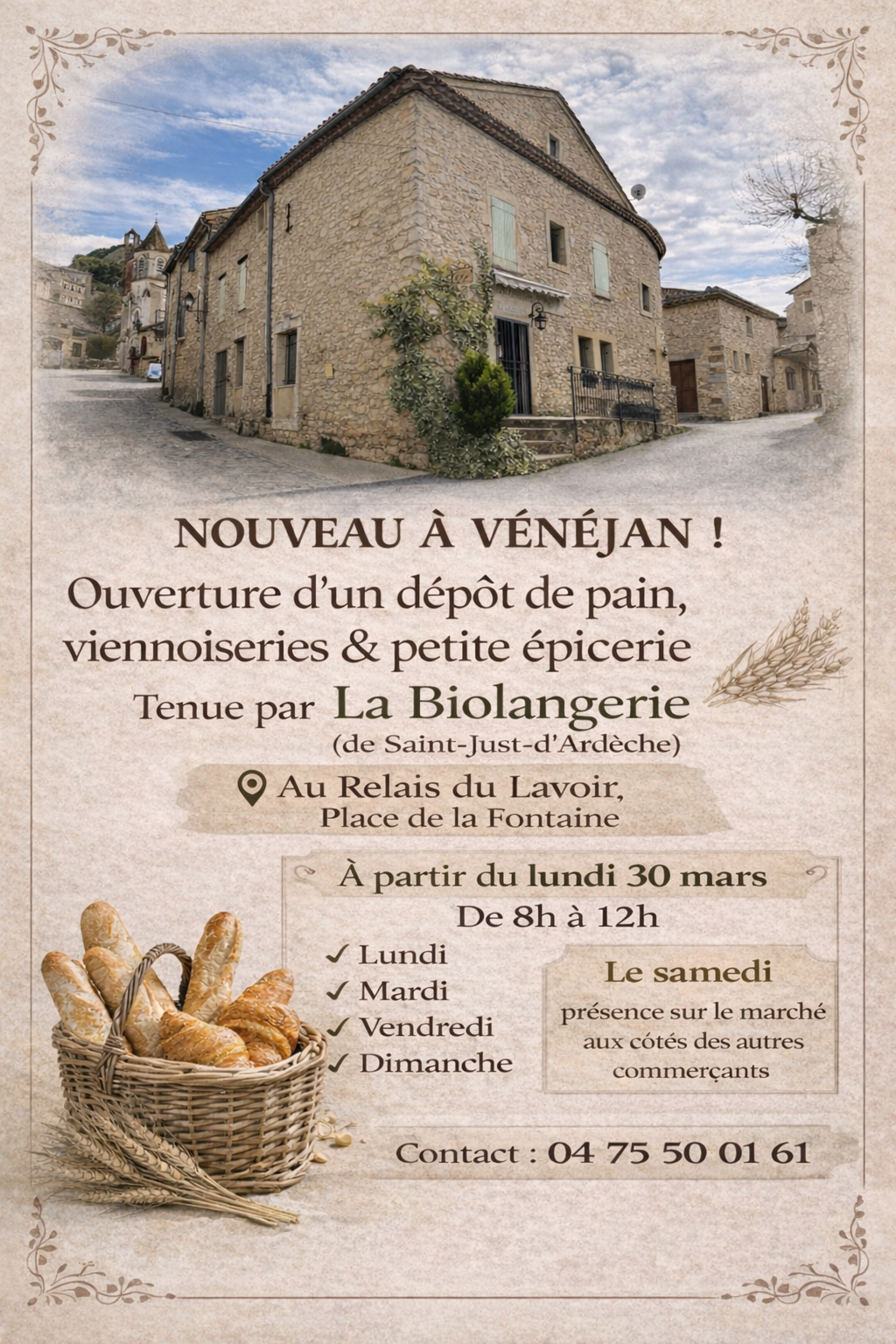 Afin de pouvoir assurer le service de boulangerie sur le village nous avons contacté Isabelle Barthélemy, responsable de la « Biolangerie » de Saint-Just-d’Ardèche. À l’issue de cet échange, il a été convenu de la mise en place d’un dépôt de vente proposant pains, petites viennoiseries ainsi qu’un assortiment d’épicerie au Relais du Lavoir, Place de la Fontaine.