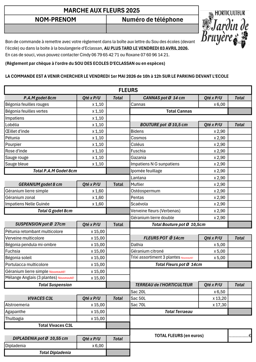 Vos commandes seront à retirer le Vendredi 1er Mai de 10h à 12h devant l'école.