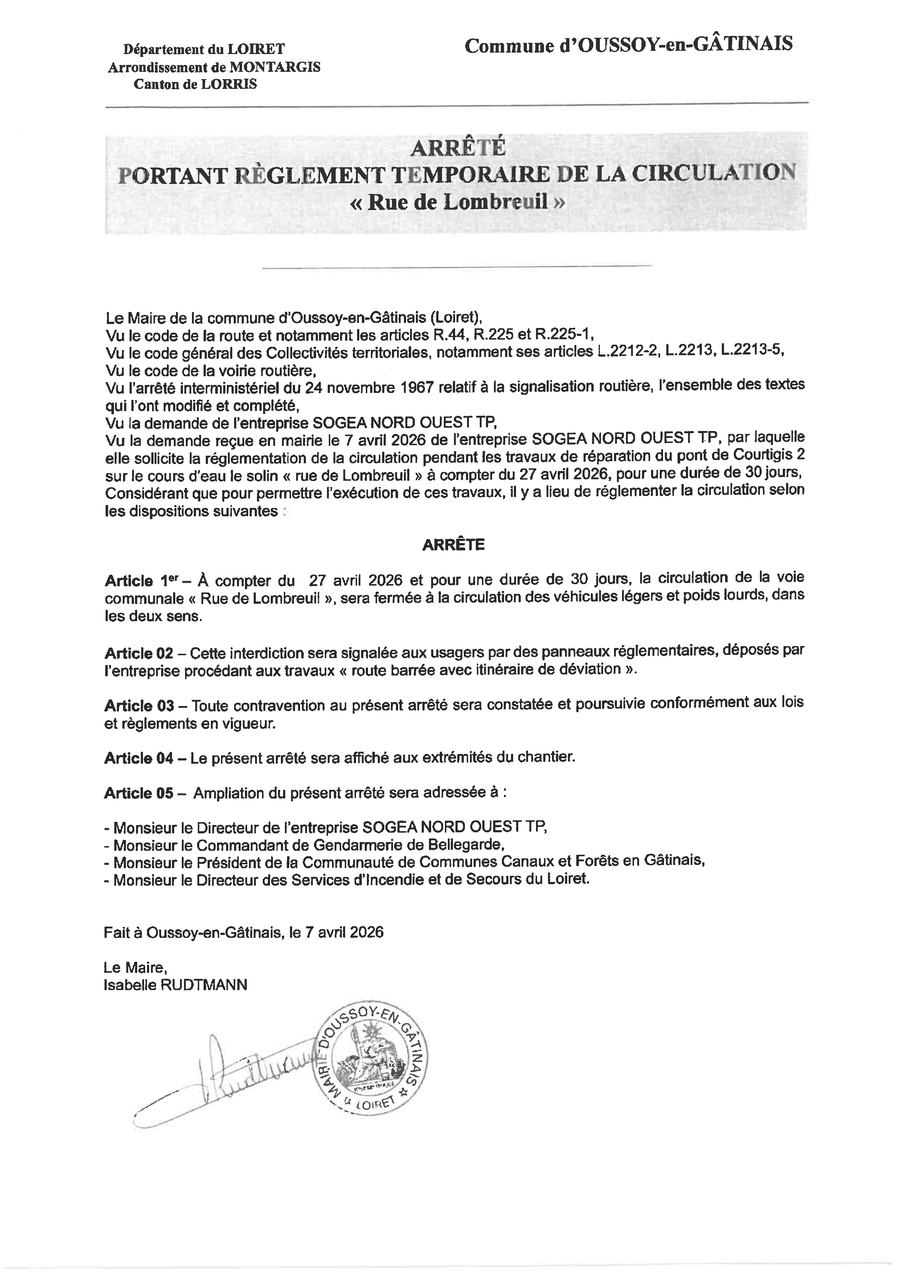 La rue de Lombreuil à Oussoy en Gâtinais sera fermée à la circulation