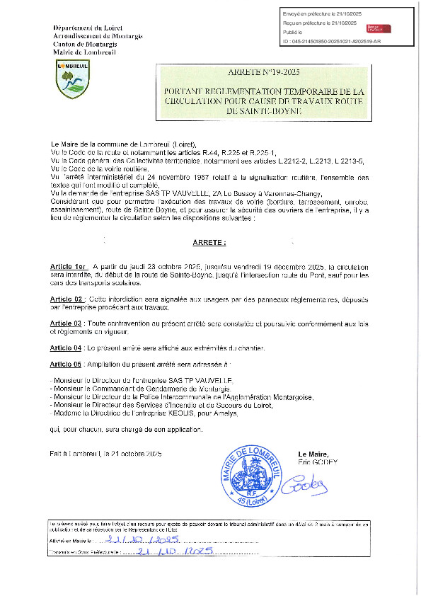 A partir du jeudi 23 Octobre 2025, jusqu'au vendredi 19 Décembre 2025, la circulation sera interdite, du début de la route de Sainte-Boyne, jusqu'à l'intersection de la route du Pont, sauf pour les cars des transports scolaires.