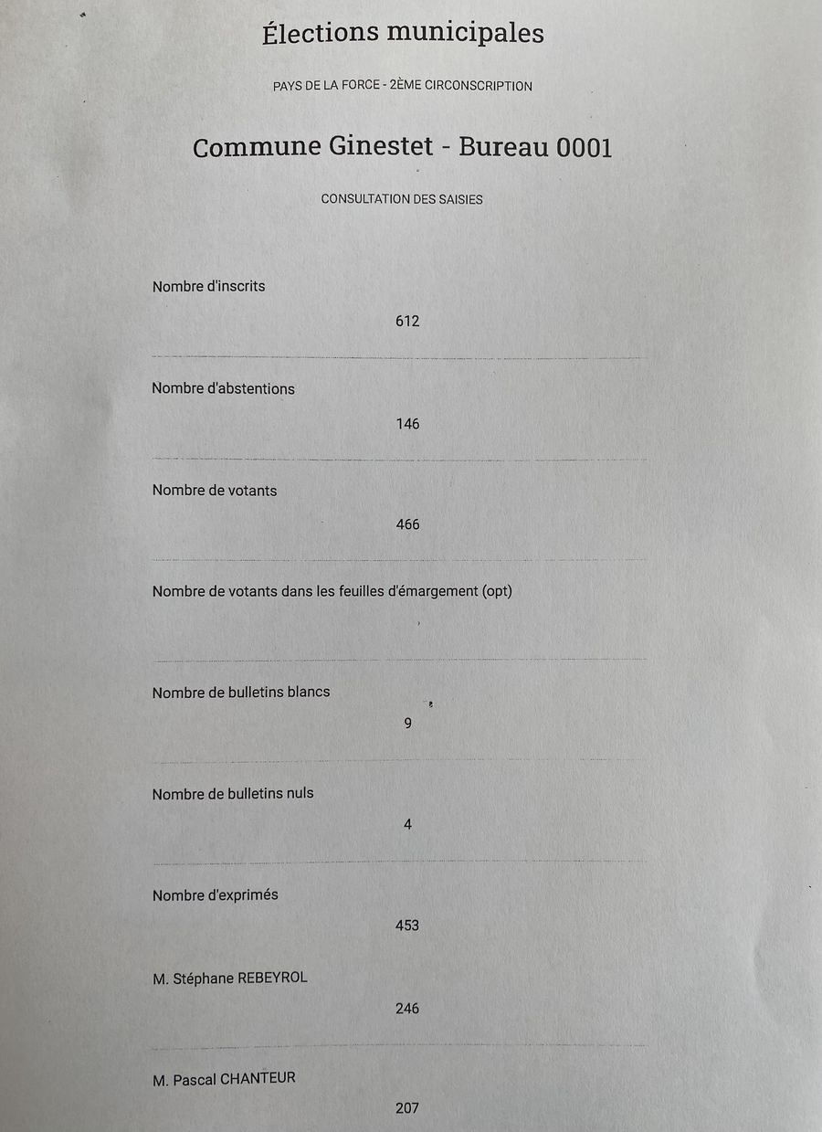 Au premier tour, la liste conduite par Stéphane REBEYROL est arrivée en tête avec un score de 54.3 %.