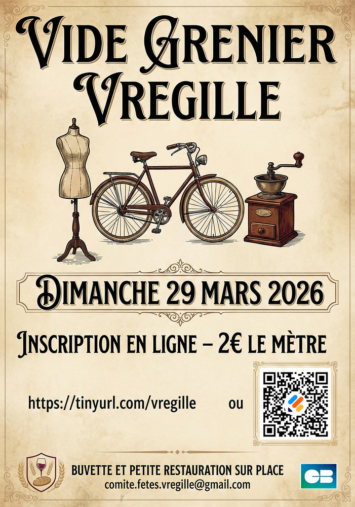Le Comité des Fêtes de Vregille est heureux de vous annoncer le retour de son traditionnel vide-grenier le dimanche 29 mars prochain. Après une année d'absence, nous avons à cœur de relancer cet événement qui marque le début de la saison des brocantes dans notre secteur.