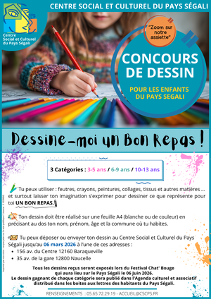 🎨 N'oubliez pas aussi le concours pour les enfants du Pays Ségali, dessiner un bon repas ! Vous avez jusqu'au 6 mars pour apporter le dessin de votre enfant.