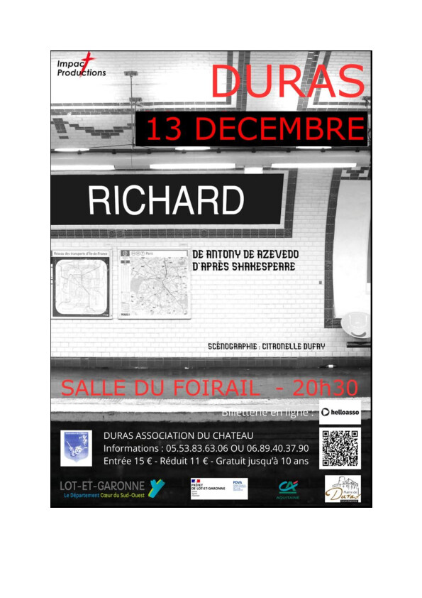 Le dernier spectacle de l'année 2025 organisé par Duras Association du Château sera une soirée théâtre avec la pièce RICHARD de et avec Antony de Azevedo (adaptation de Richard III de Shakespeare) et Ludivine Cornec.