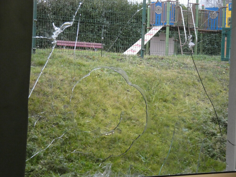Une vitre de notre salle communale a été vandalisée par jet de galets. Les deux vitrages ont été affectés ainsi que témoigne la photo ci-jointe.