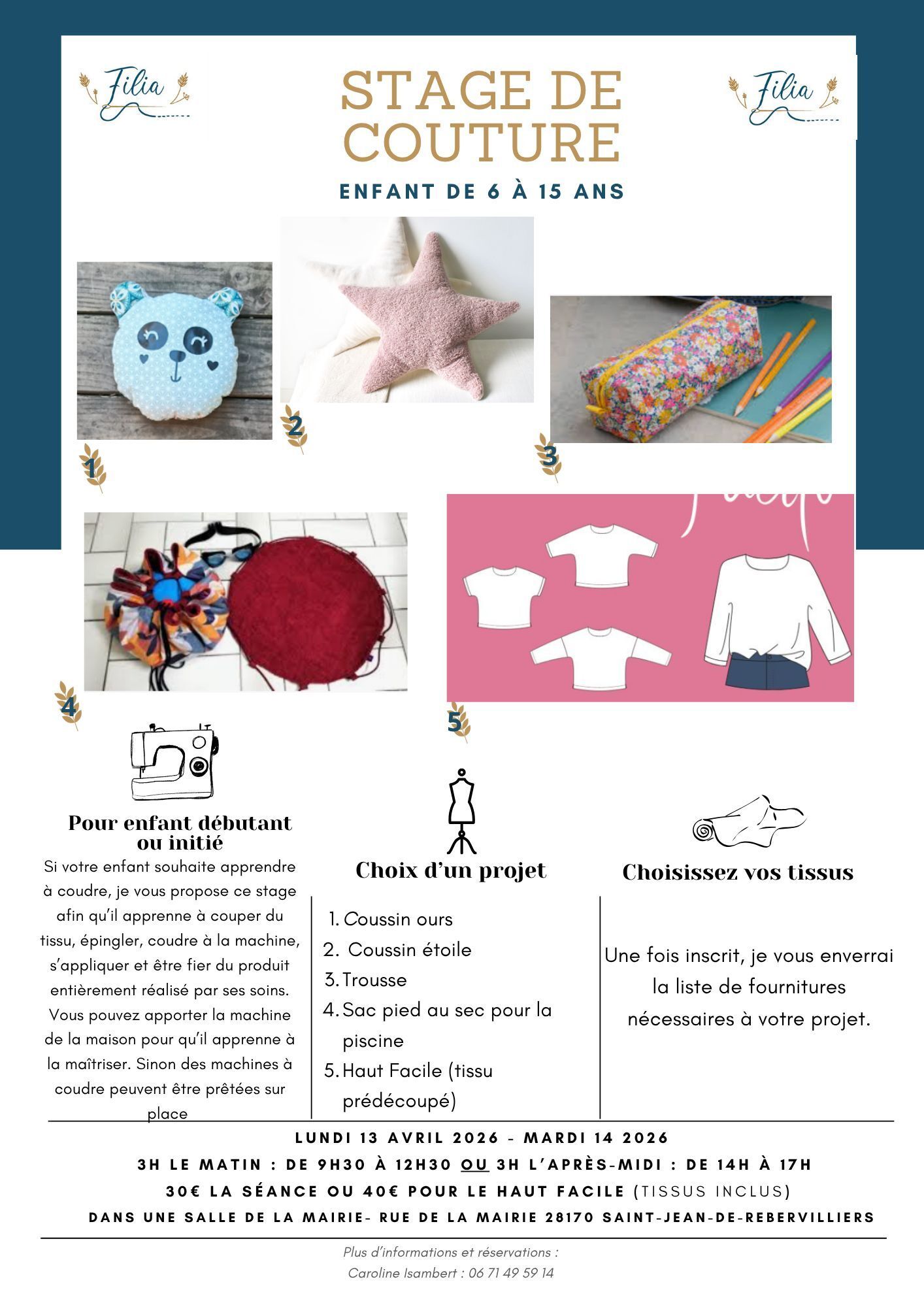 Votre enfant souhaite apprendre à coudre, ce stage est pour lui. Il prendra plaisir à confectionner lui-même son coussin ou sa trousse ou un sac ou même un vêtement.