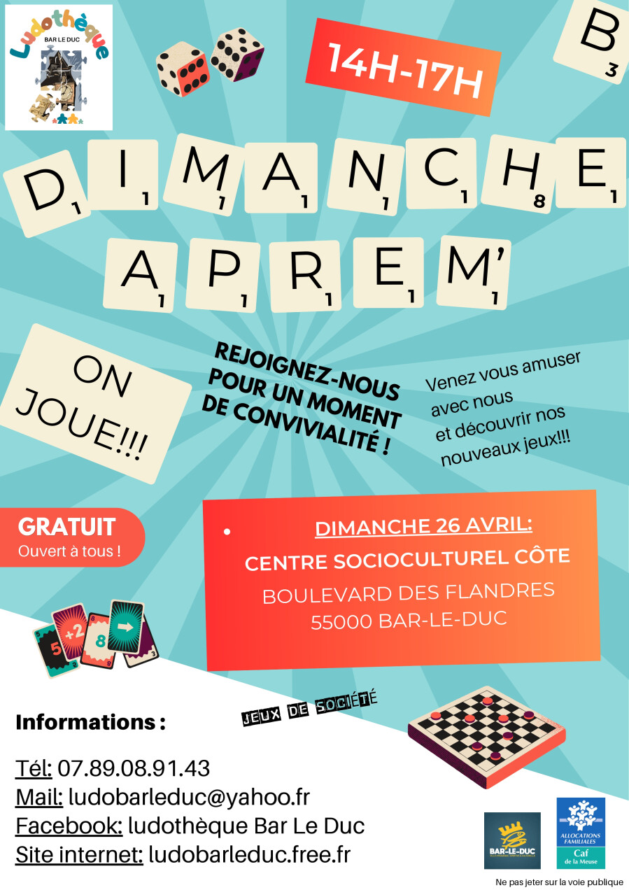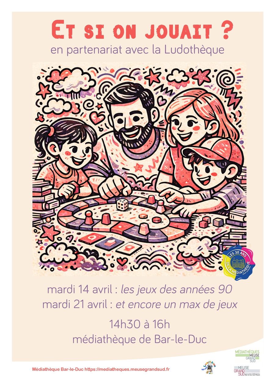 Le mardi 14 et le mardi 21 avril, de 14h30 à 16h, nous serons présents au sein de l'espace jeunesse de la médiathèque de Bar-le-Duc afin de vous faire découvrir des jeux !