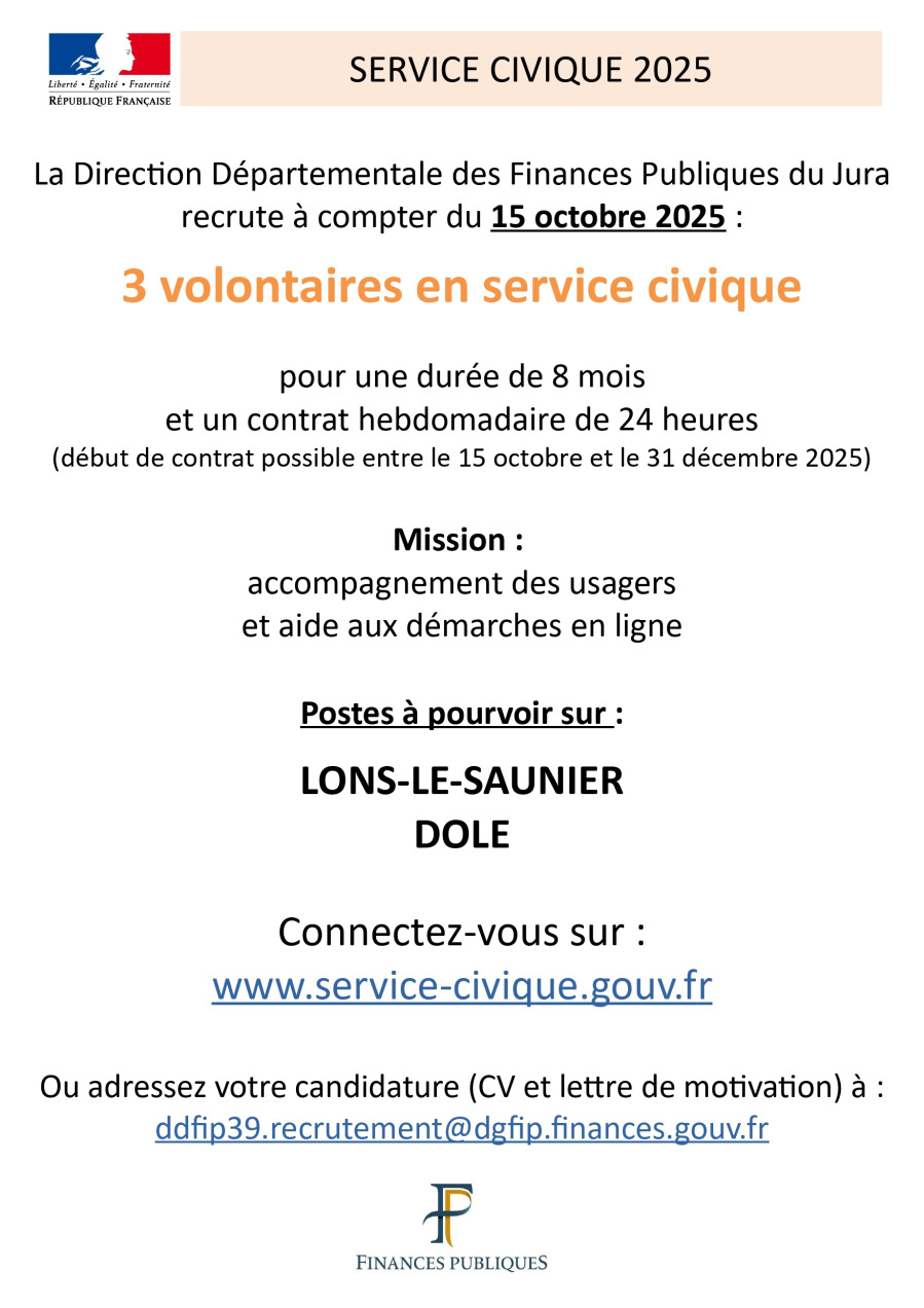La DDFiP du Jura a la possibilité de recruter trois volontaires en service civique dans le cadre d’un engagement organisé au titre de l’année 2025.