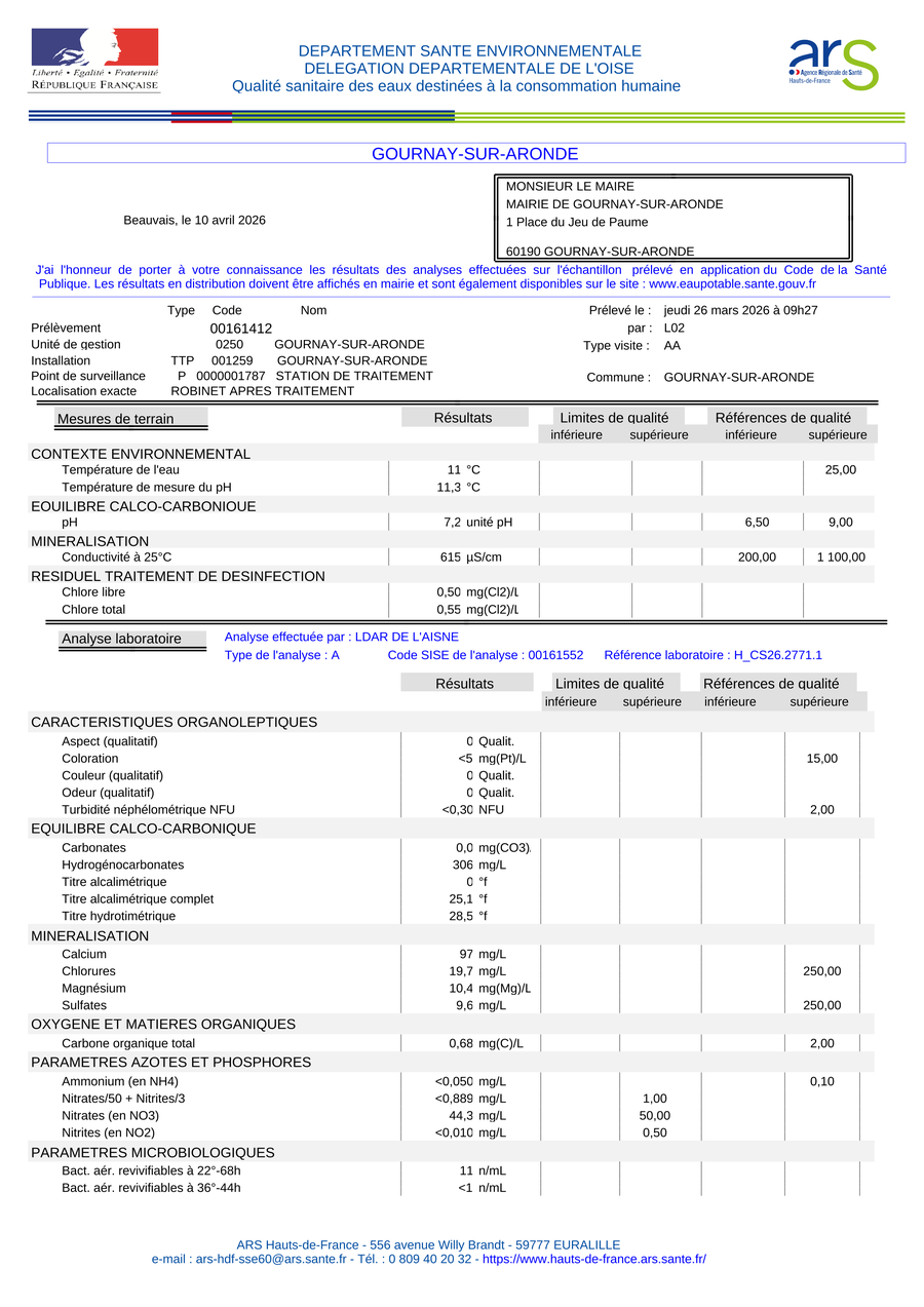 Bulletin d'analyses du contrôle sanitaire des eaux destinées à la consommation humaine.
