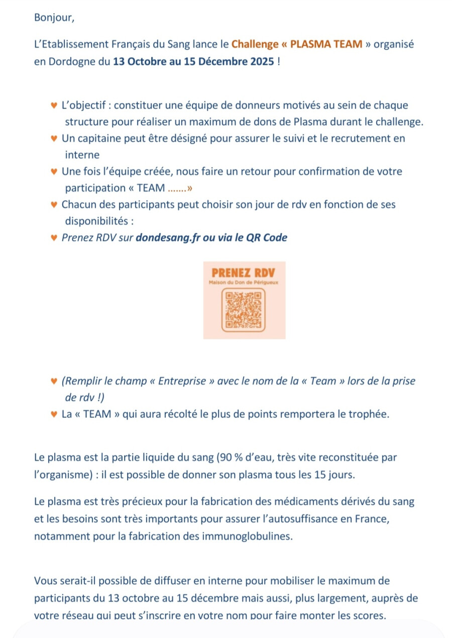 L' EFS organise un challenge don du sang, don de plasma pour sauver des vies .