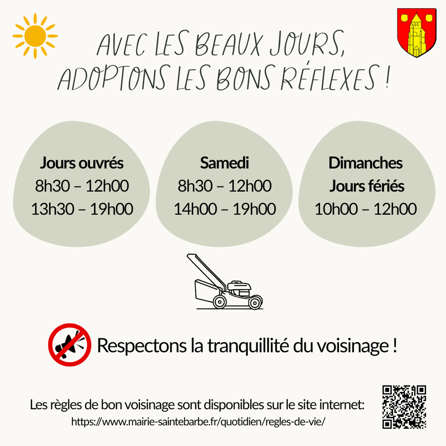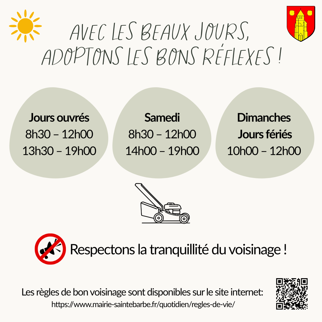 Afin de prĂ©server la tranquillitĂ© de chacun, merci de respecter les horaires autorisĂ©s pour lâutilisation des tondeuses et outils bruyants.