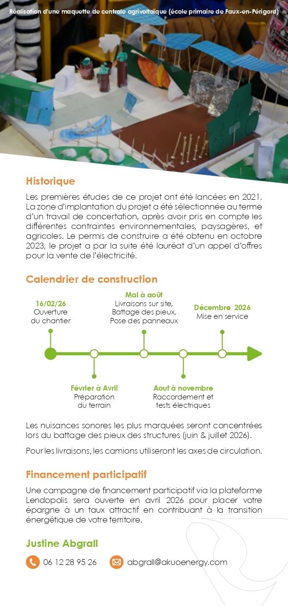 Le projet de parc agrivoltaïque, porté par la société Akuo, au niveau des lieux-dits la Potence et le Bois de Pichot à Faux, est actuellement en construction.