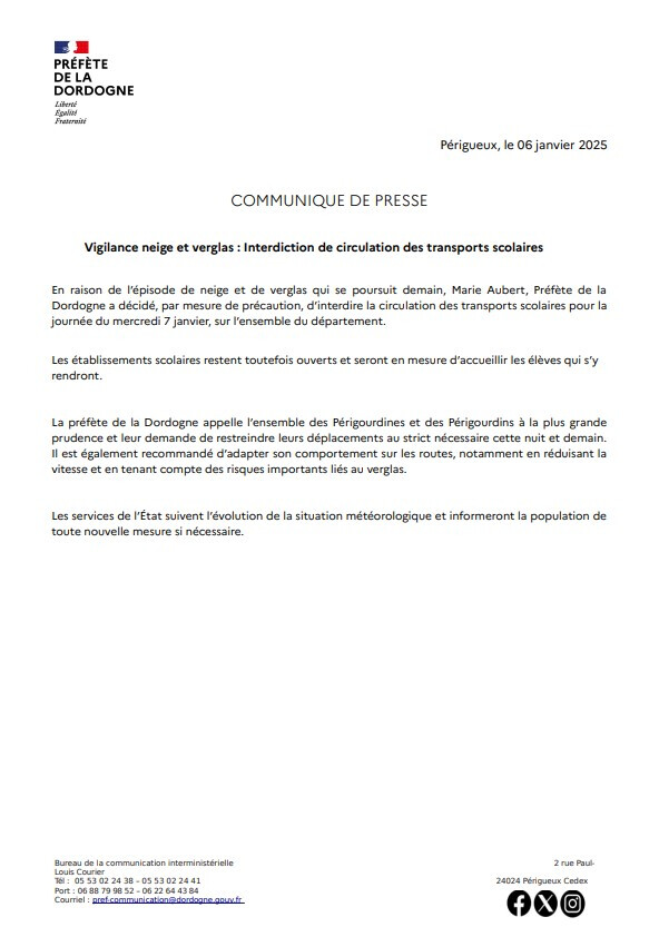 la Préfecture de la Dordogne nous informe de la fin de l'interdiction de circulation des transports scolaires sur le département de la Dordogne.