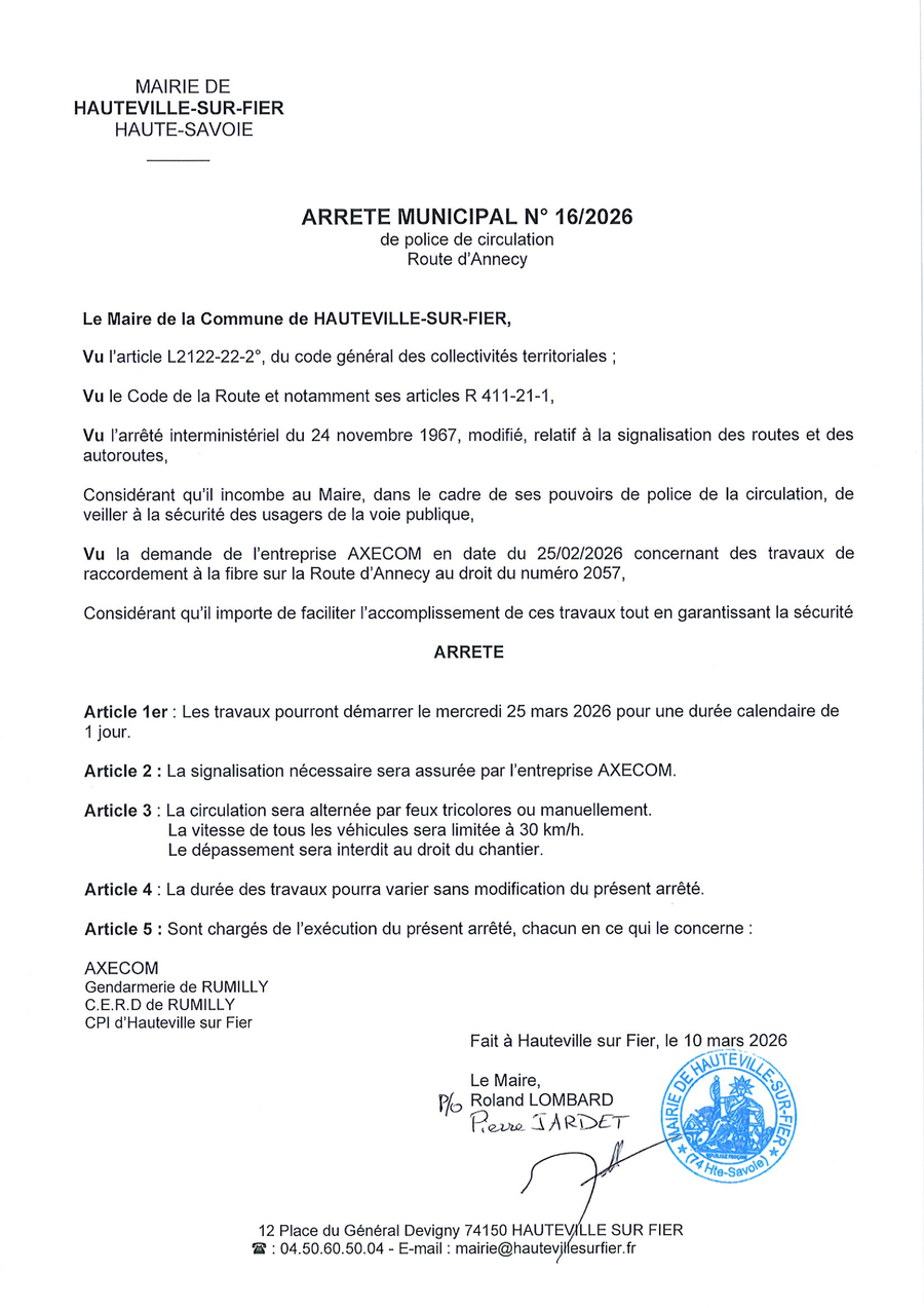 Le 25 Mars 2026 l'entreprise AXECOM va effectuer des travaux de raccordement à la fibre sur la Route d'Annecy au niveau du numéro 2057.