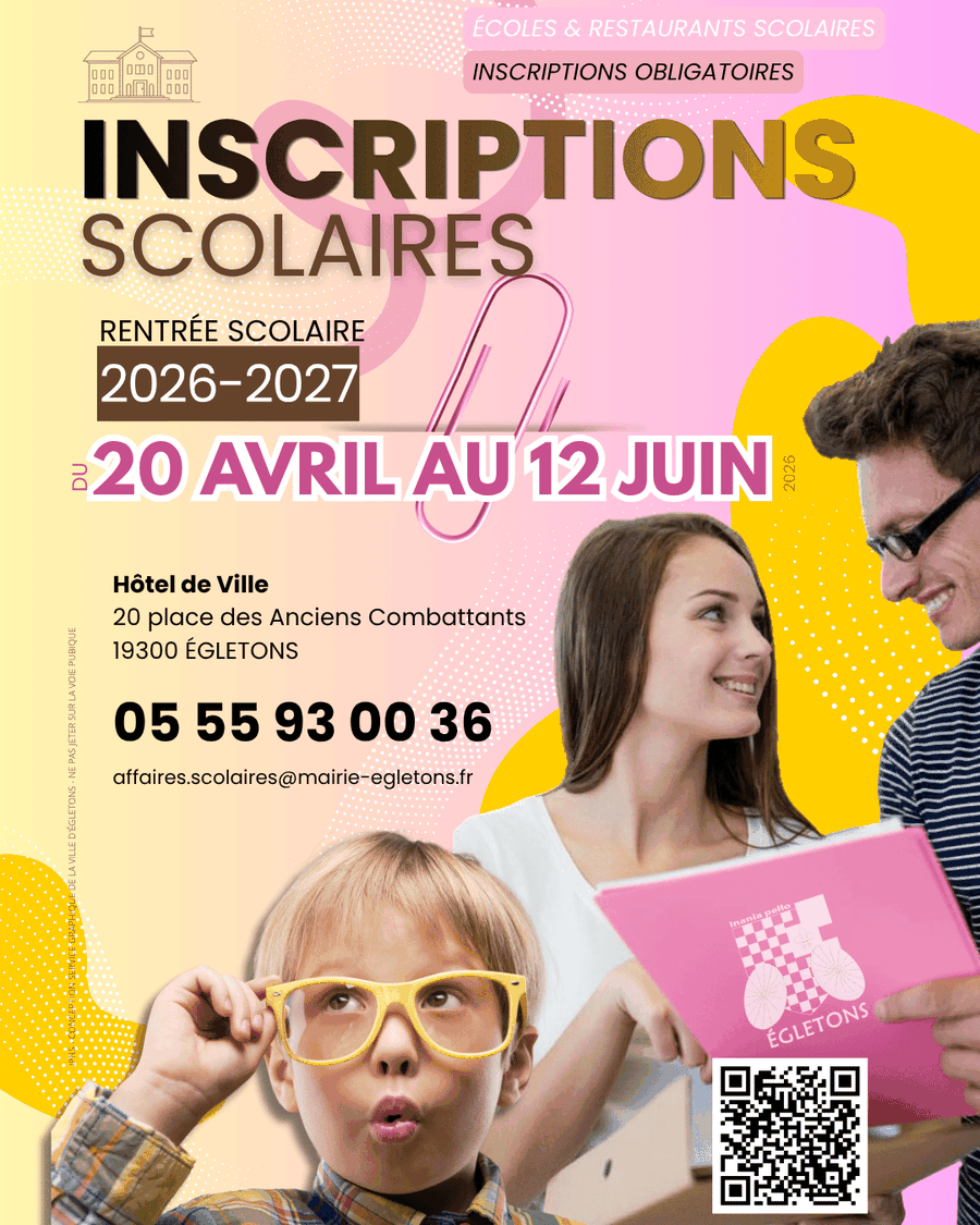Retrouvez le dossier de pré-inscription en mairie ou sur le site internet : https://www.egletons.fr/actualites/inscriptions-scolaires/