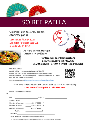 🗓️ Inscriptions jusqu’au 22 février 2026 via le lien suivant : https://www.payasso.fr/blr-arc-mosellan/paella