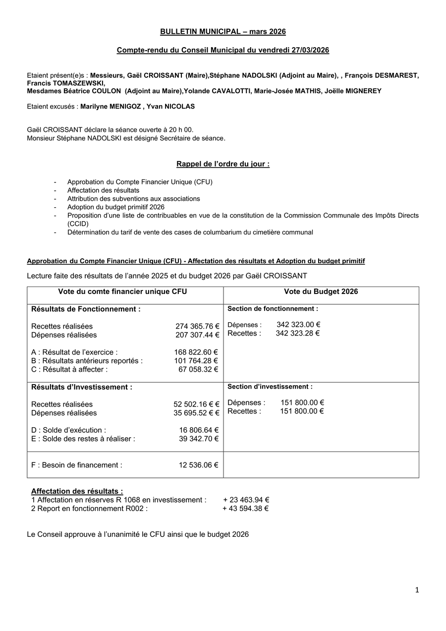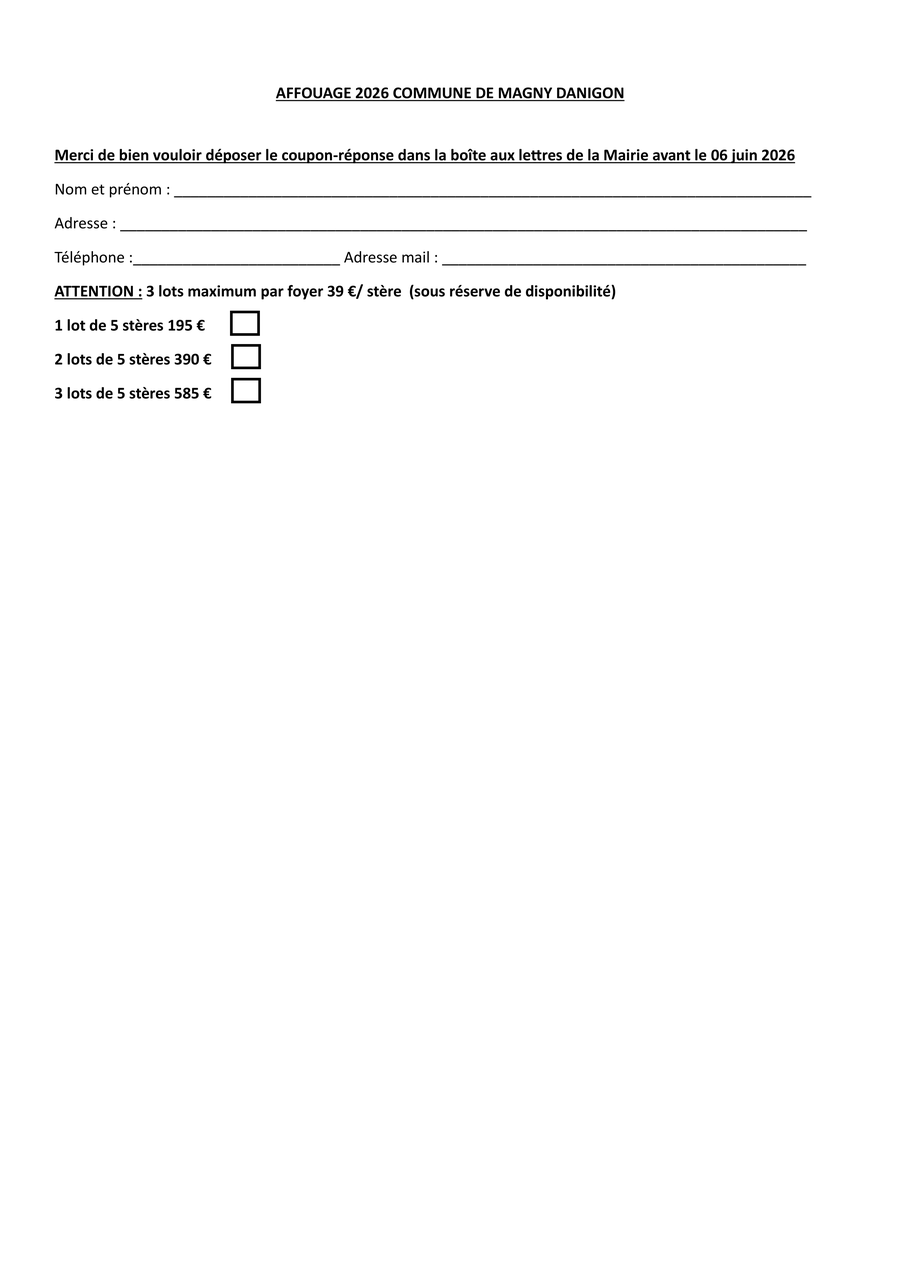 Vous trouverez ci-joint le bulletin d’inscription pour l’affouage 2026, cette année les lots seront de 5 stères, 3 lots maximum par foyer, bulletin a déposé à la maire pour le 06/06/2026 dernier délai