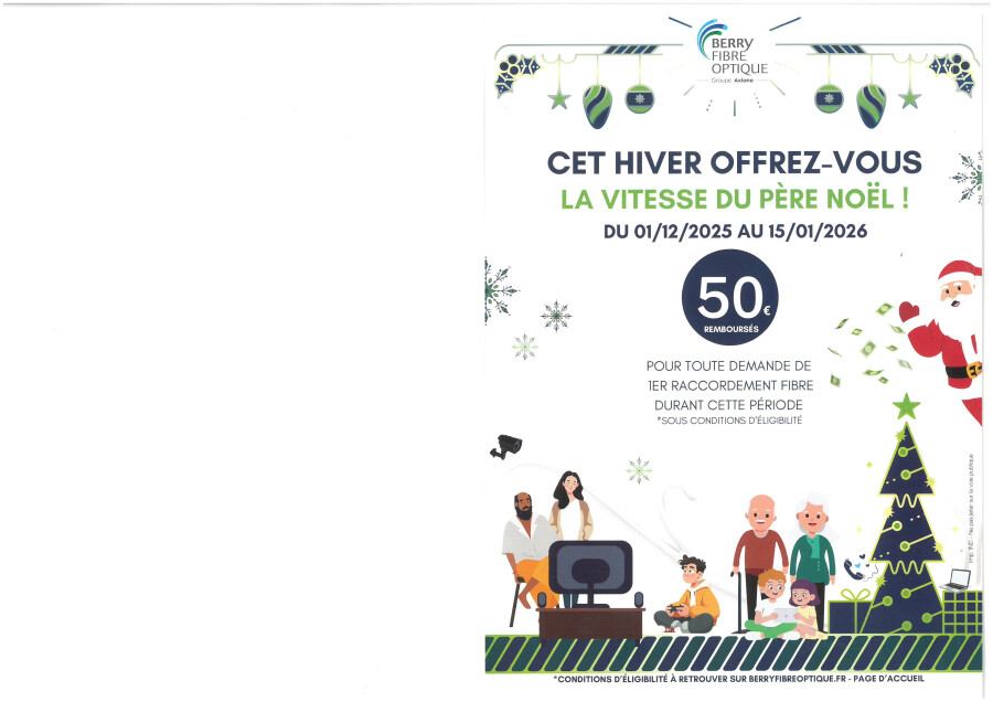 La première souscription à une offre fibre FTTH doit être effectuée entre le 1ᵉʳ décembre 2025 et le 15 janvier 2026 auprès d’un fournisseur d’accès internet utilisant le réseau de Berry Fibre Optique