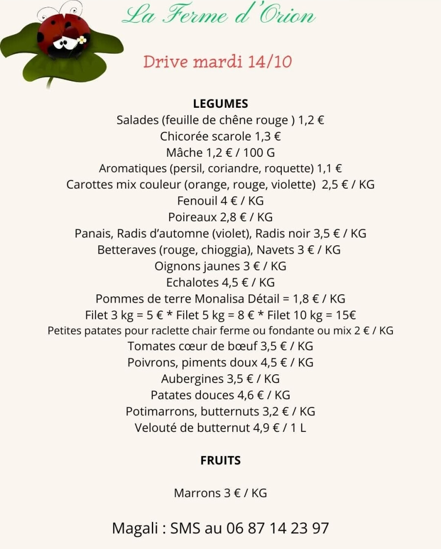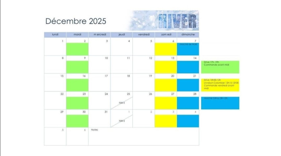 En remplacement, je vous proposerai un 2ème drive, le samedi matin jusqu'au 3 janvier 2026, avec possibilité de récupérer votre commande au village (place de la mairie).