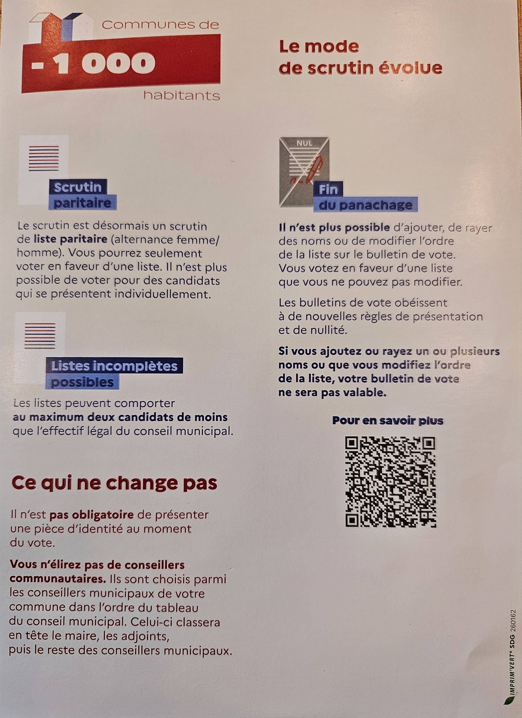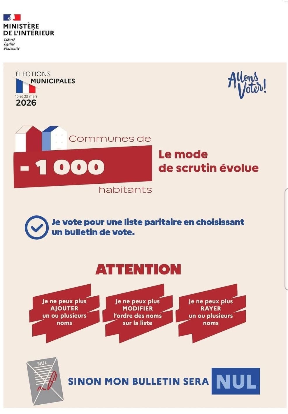 Dans les communes de - de 1000 habitants, le panachage ou l’ajout de candidats sur le bulletin n’est plus possible. Tout bulletin raturé ou modifié sera considéré comme NUL.