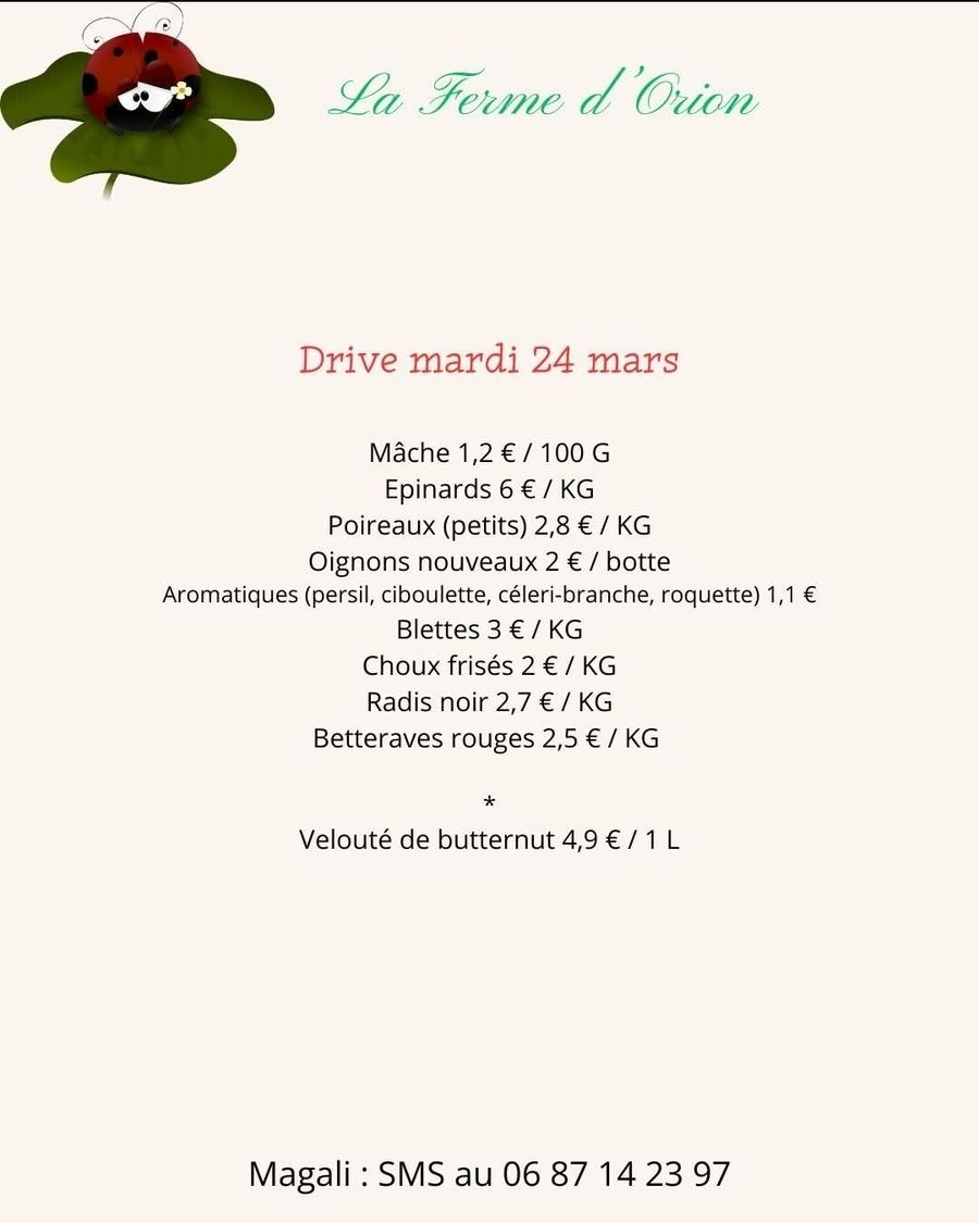 Je vous propose un drive à la ferme MARDI 24 Mars. Vous pouvez commander par SMS (06 87 14 23 97) jusqu'à mardi midi et récupérer vos légumes entre 17h et 19h.