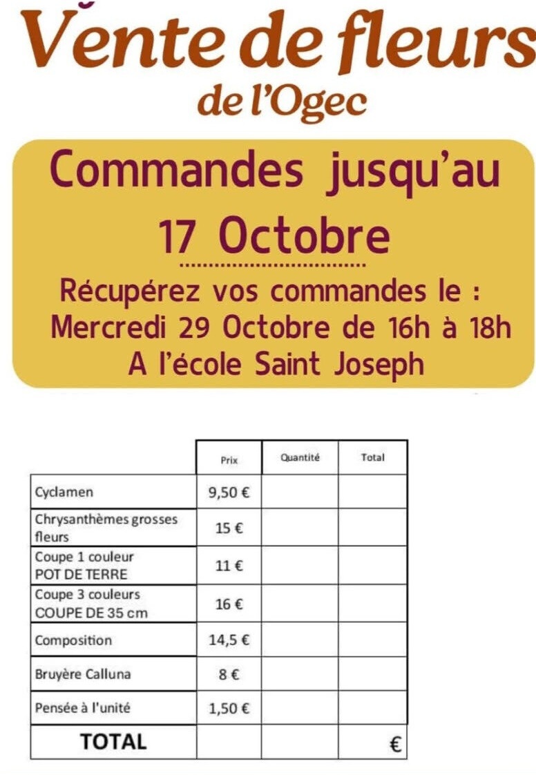 Fin des commandes le 17 octobre et la réception de vos plantes se fera le mercredi 29 octobre à l'école St Joseph.
