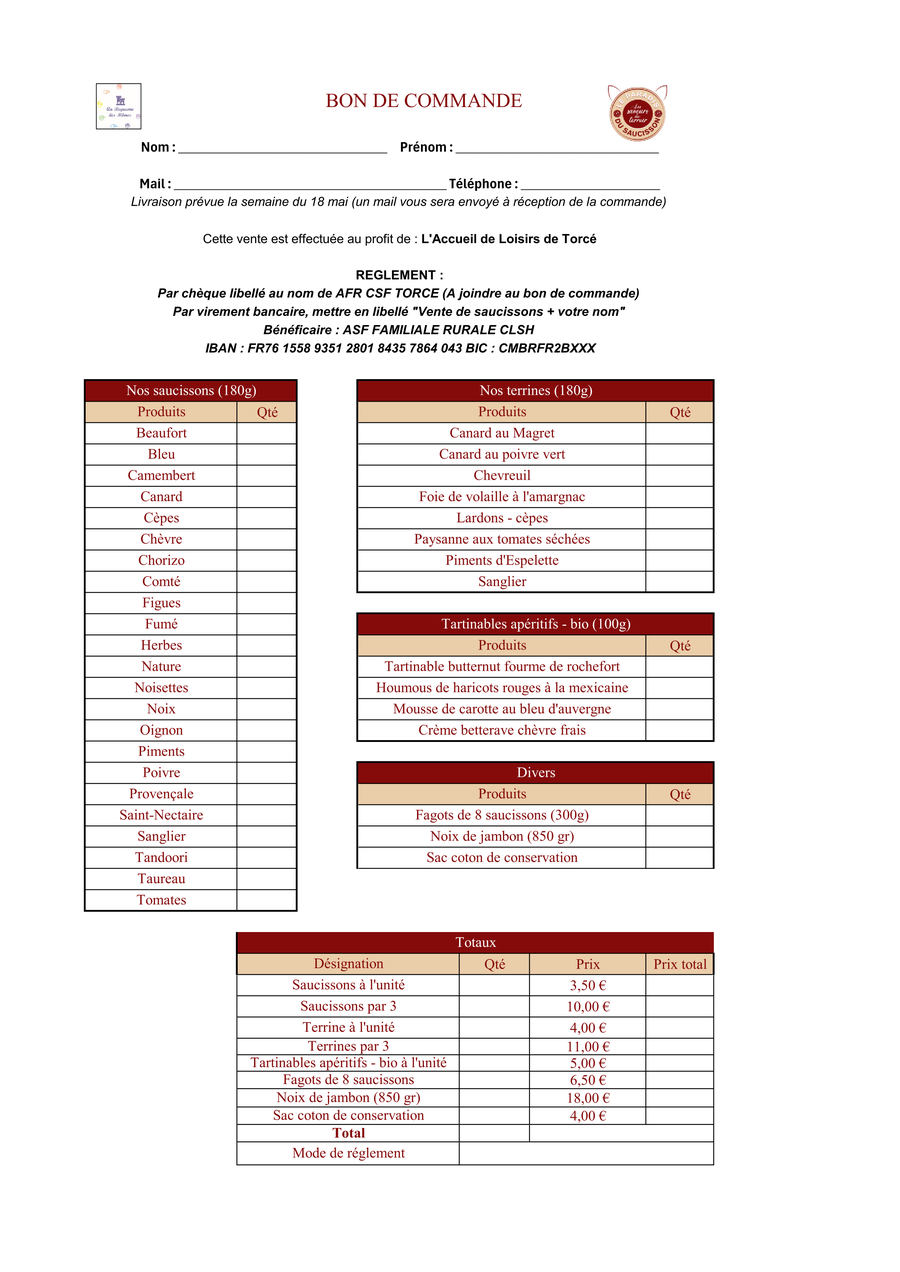 Pour les paiements par virement, il est possible d’envoyer votre bon de commande par mail.