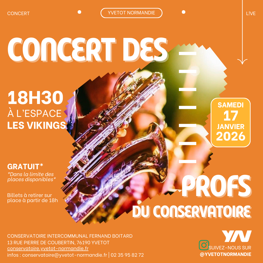 Le CONCERT DES PROFESSEURS, une représentation proposée par le Conservatoire de musique intercommunal Yvetot Normandie, le 17/01/2026 à 18h30, à l'espace Les Vikings. Gratuit.