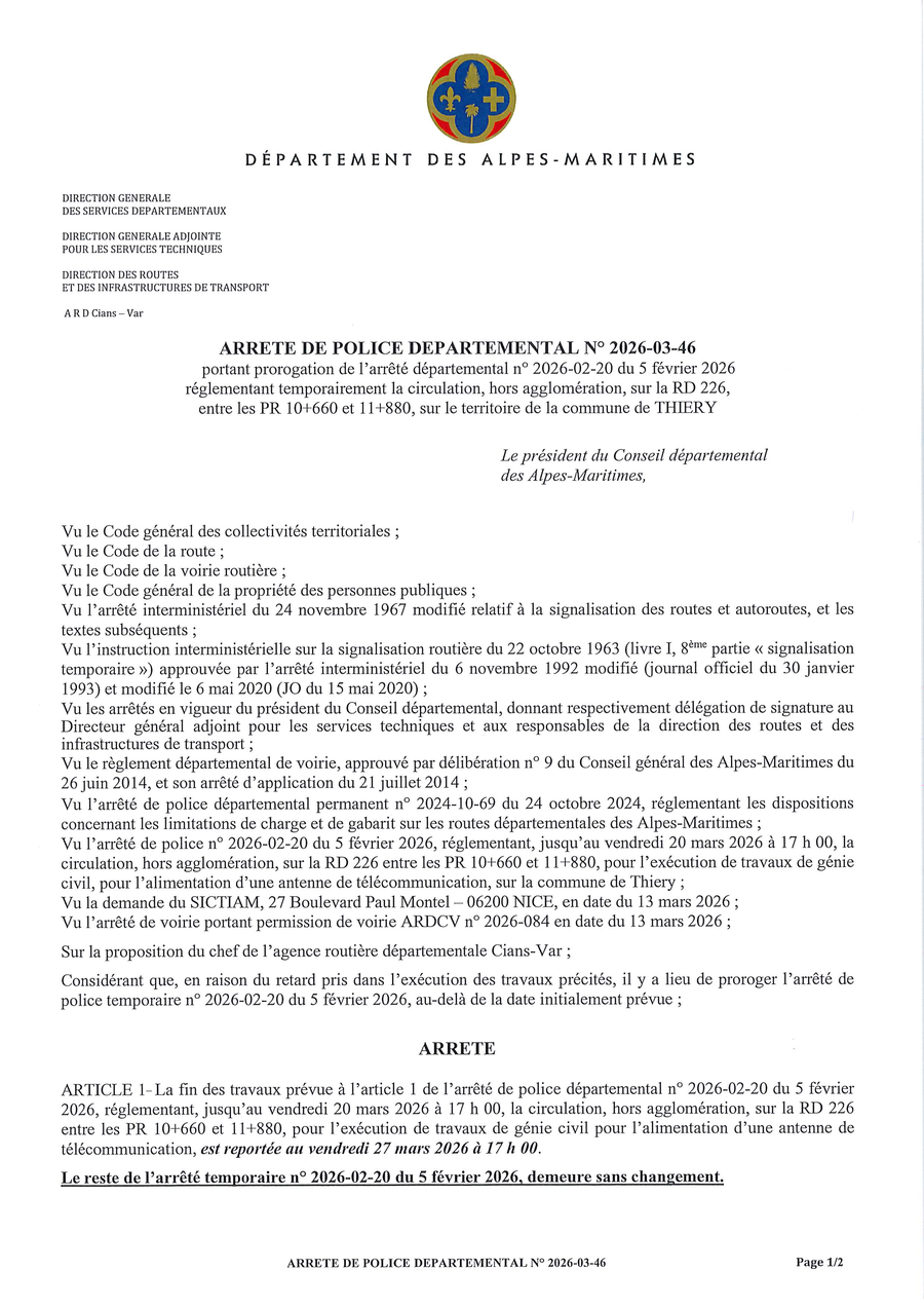 La RD 226 restera fermée du 23 au 27 mars, en semaine, de jour, de 8h30 à 12h00 et de 13h30 à 17h00, pour terminer les travaux d'adduction électrique du relais de téléphonie mobile entre les PR 10+660 et 11+880.