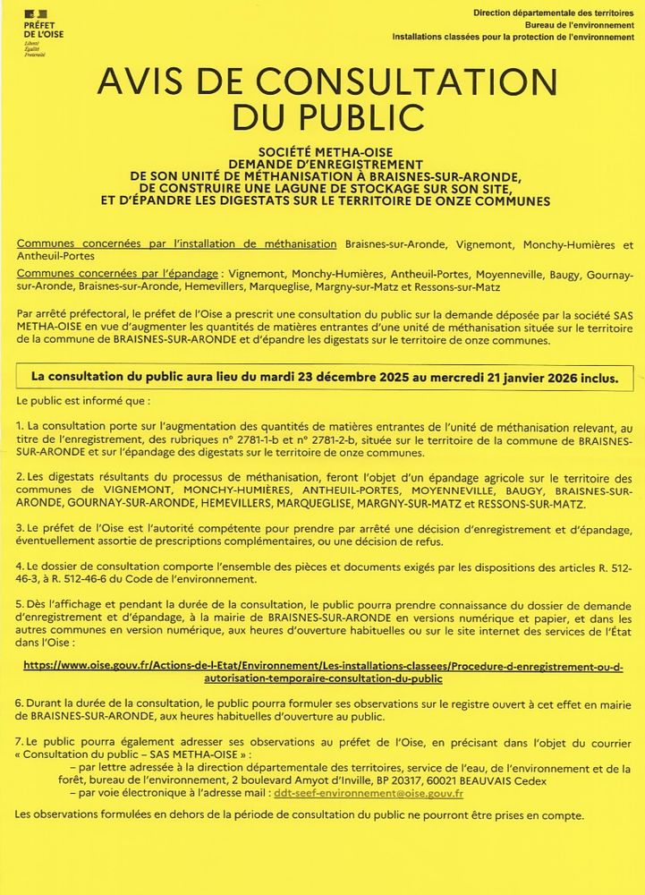 Plus que quelques jours pour les personnes qui veulent formuler un avis relatif à la consultation du public concernant la société Metha-Oise sur le registre qui se tient en mairie de Braisnes-Sur -Aronde.