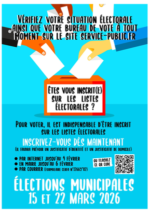 – L’inscription est possible jusqu’à 6 semaines du scrutin. Pour les élections municipales 2026, il sera possible de s’inscrire sur les listes électorales en ligne jusqu’au 4 février 2026 et en mairie jusqu’au 6 février 2026.